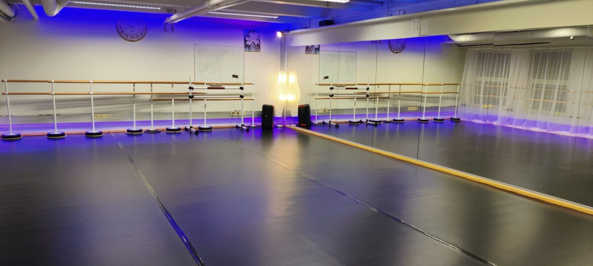 Tanssilattian mitat: 10 m (peiliseinä) x 6 m. Katto on matala. Salissa on kestävä tanssimatto, suuret peilit ja äänentoistolaitteet, 5m pitkä kiinteä balettitanko, joogamatot ja joogablokit.